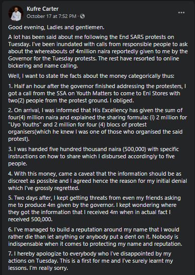 A lot has been said about me following the End SARS protests on Tuesday. I’ve been inundated with calls from responsible people to ask about the whereabouts of 4million naira reportedly given to me by the Governor for the Tuesday protests. The rest have resorted to online bickering and name calling.