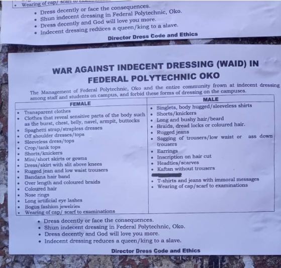 The document was distributed to students of Federal Polytechnic Oko to make them aware of the dress code in the institution and social media users are outraged.