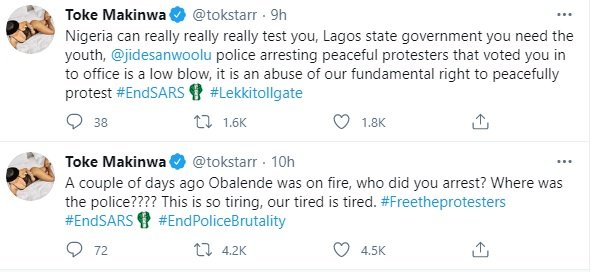 “Nigeria can really really really test you, Lagos state government you need the youth, @jidesanwoolu police arresting peaceful protesters that voted you in to office is a low blow, it is an abuse of our fundamental right to peacefully protest #EndSARS #Lekkitollgat.”