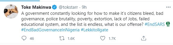 On her Twitter page, Makinwa wrote: “A government constantly looking for how to make its citizens bleed, bad governance, police brutality, poverty, extortion, lack of Jobs, failed educational system, and the list is endless, what is our offense? #EndSARS #EndBadGovernanceInNigeria #Lekkitollgate.”