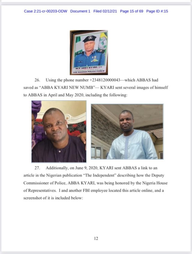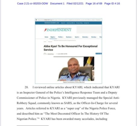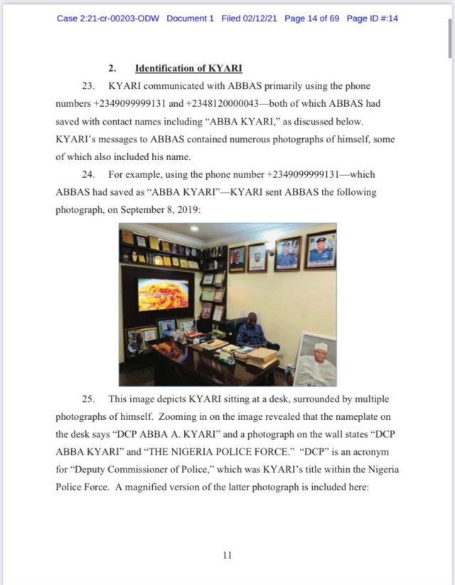 According to the court documents , DCP Abba Kyari “together with others known and unknown to the Grand Jury, knowingly conspired to commit wire fraud, in violation of Title 18, United States Code, Section 1343”.
