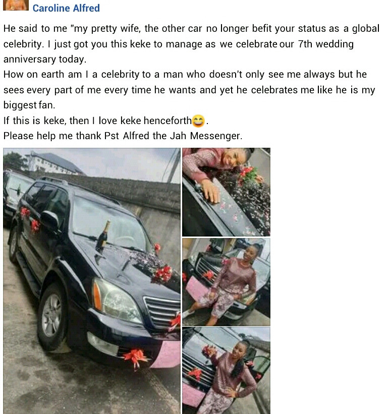 “He said to me “my pretty wife, the other car no longer befit your status as a global celebrity. I just got you this keke to manage as we celebrate our 7th wedding anniversary today. How on earth am I a celebrity to a man who doesn’t only see me always but he sees every part of me every time he wants and yet he celebrates me like he is my biggest fan. If this is keke, then I love keke henceforth. Please help me thank Pst Alfred the Jah Messenger”