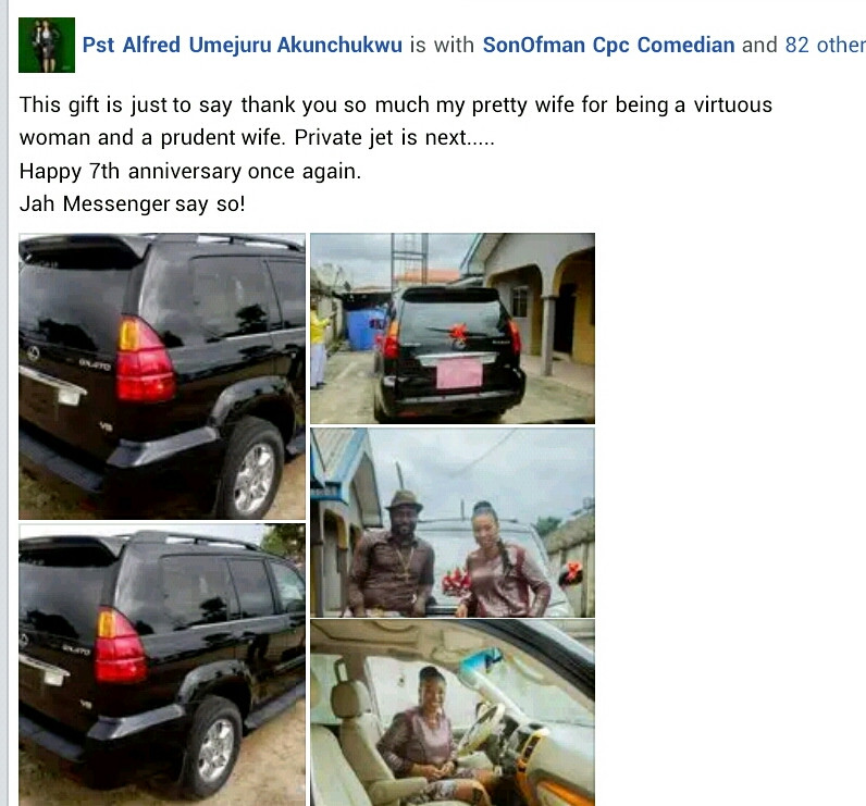 A Nigerian pastor, Alfred Akunchukwu (a.k.a Jah Messenger) has made his wife happy.