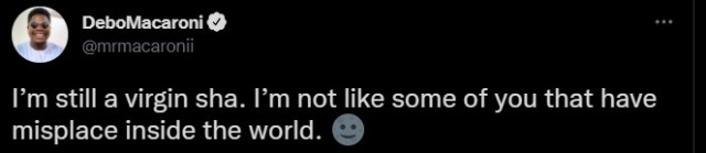 I’m still a virgin sha. I’m not like some of you that have misplace inside the world.
