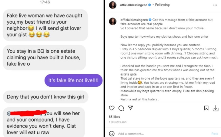 Blessing Okoro Relationship coach, Blessing Okoro has responded after a troll implicated her of living a phony life. The giant in an exchange with Blessing, pledged to expose her house location after she discovered she lives in a boy’s quarters in somebody’s home.