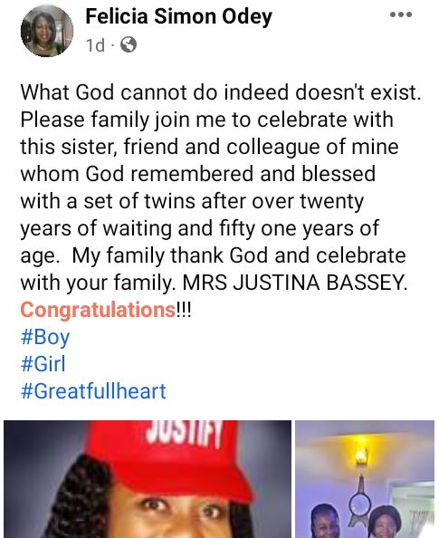 “What God can refrain from doing certainly does not exist. Please household join me to commemorate with this sis, pal and coworker of mine whom God remembered and blessed with a set of twins after over twenty years of waiting and fifty one years of age.